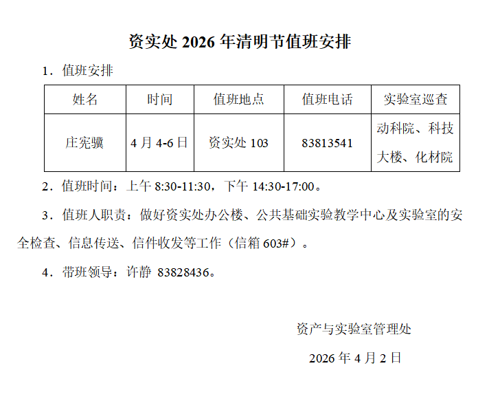 资实处2026年清明节值班安排
